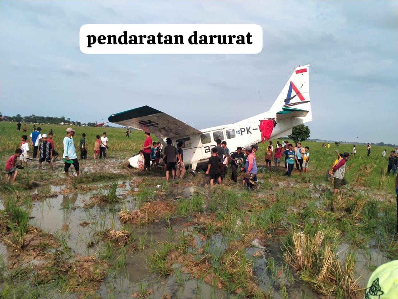 Karena jarak menuju bandara terdekat masih sekitar 30 mil, pilot memutuskan melakukan pendaratan darurat di area persawahan warga. Pesawat berhasil mendarat sekitar pukul 14.20 WIB.